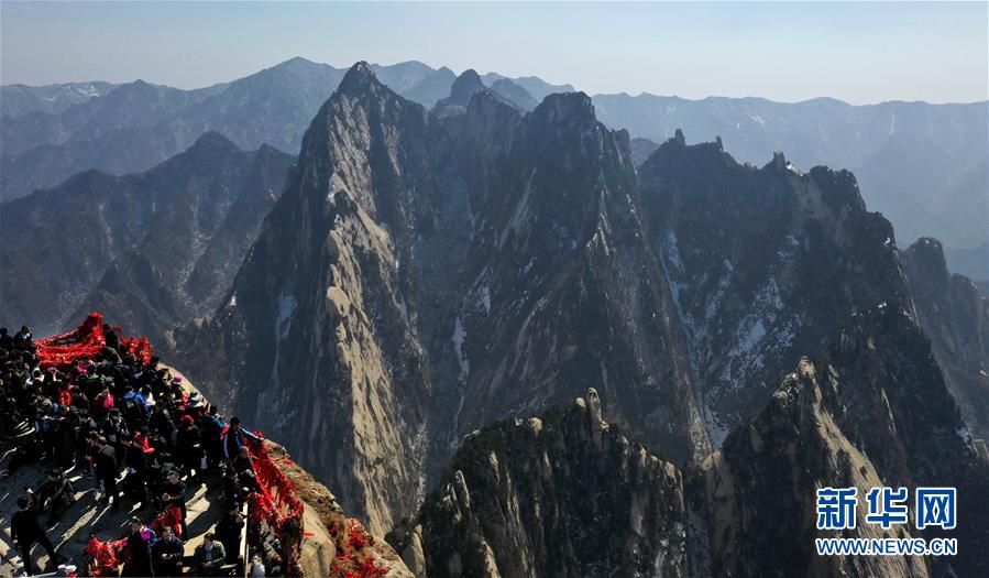 3月9日,游人在華山南峰游覽(無人機拍攝)。 隨著氣溫回升,陜西著名風(fēng)景區(qū)華山進(jìn)入旅游旺季。 新華社記者 陶明 攝
