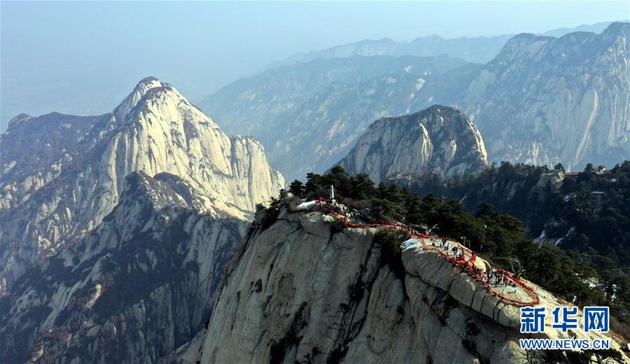3月9日,游人在華山南峰游覽(無人機(jī)拍攝)。 隨著氣溫回升,陜西著名風(fēng)景區(qū)華山進(jìn)入旅游旺季。 新華社記者 陶明 攝