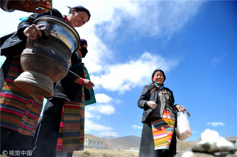 2019年3月16日,西藏各地迎來(lái)開耕節(jié)。位于年楚河畔的日喀則白朗縣被譽(yù)為“后藏糧倉(cāng)”,當(dāng)日,當(dāng)?shù)夭刈遛r(nóng)牧民將家里的耕牛裝扮一新,對(duì)農(nóng)田進(jìn)行開耕,大家齊聚青稞地,慶祝春播開始。圖為白朗縣洛江鎮(zhèn)民眾在青稞地里煨桑煙(一種祈福方式)、敬獻(xiàn)青稞酒,祈福新的一年風(fēng)調(diào)雨順、五谷豐登。  江飛波(西藏分社)/中新社/視覺中國(guó) 編輯/陳進(jìn)