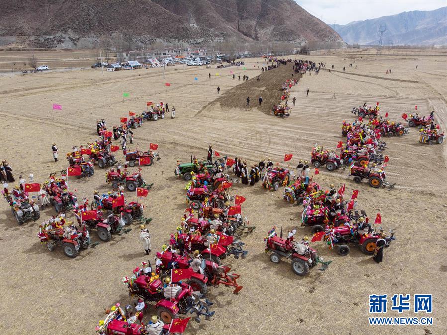 3月16日拍攝的拉薩市達(dá)孜區(qū)唐嘎鄉(xiāng)開耕儀式現(xiàn)場(chǎng)。 當(dāng)日,西藏各地男女老幼身著節(jié)日盛裝,駕著一輛輛由彩旗、花朵裝扮一新的拖拉機(jī),涌向待墾的農(nóng)田,載歌載舞迎來(lái)一年一度的開耕儀式。 新華社記者 張汝鋒 攝