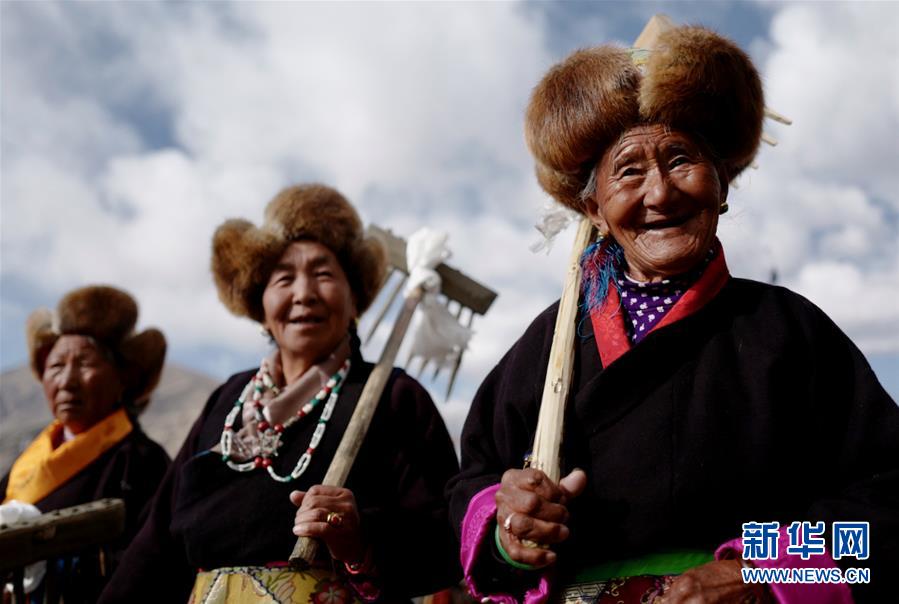 3月16日,山南市乃東區(qū)克松社區(qū)居民在開耕儀式上。 當(dāng)日,西藏各地男女老幼身著節(jié)日盛裝,駕著一輛輛由彩旗、花朵裝扮一新的拖拉機(jī),涌向待墾的農(nóng)田,載歌載舞迎來(lái)一年一度的開耕儀式。 新華社記者 晉美多吉 攝