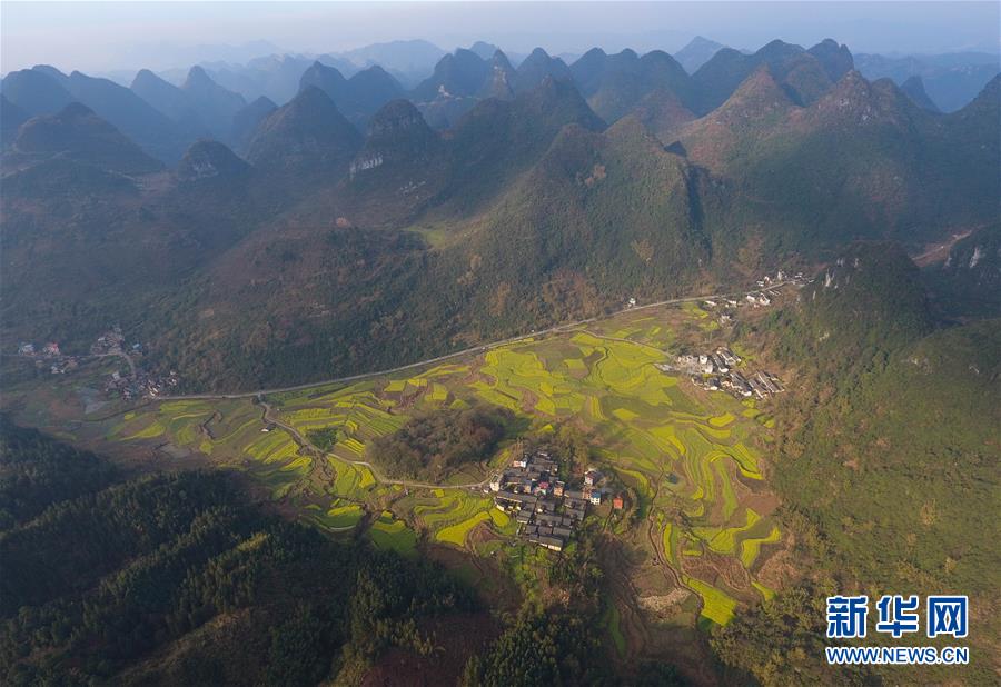 3月20日在貴州錦屏縣敦寨鎮(zhèn)拍攝的春景(無(wú)人機(jī)拍攝)。春分將至,貴州各地成片的油菜花漸次綻放,如同金色的地毯鋪上云貴高原。 新華社記者 歐東衢 攝