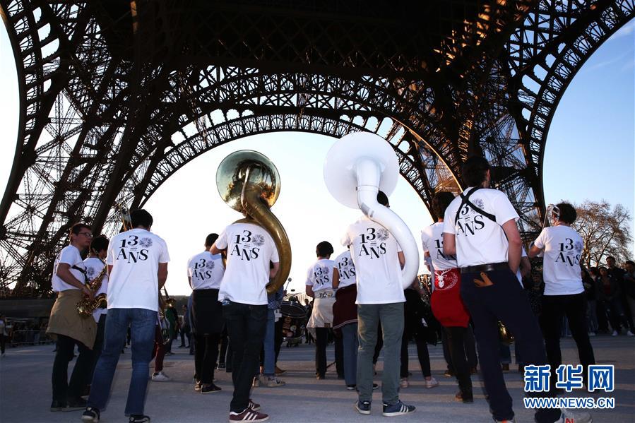 3月30日,在法國巴黎,樂隊在埃菲爾鐵塔下表演。于1889年3月31日正式落成的法國巴黎埃菲爾鐵塔迎來130歲生日。從30日起,包括演出、冒險游戲、圖片展在內(nèi)的多項活動在埃菲爾鐵塔舉行,為這座宏偉建筑慶生。新華社記者 高靜 攝
