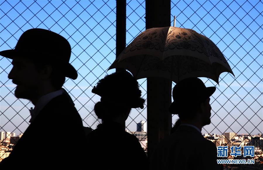 3月30日,在法國巴黎,音樂劇《300米高塔》的演員身著19世紀(jì)服裝站在埃菲爾鐵塔一層平臺上。于1889年3月31日正式落成的法國巴黎埃菲爾鐵塔迎來130歲生日。從30日起,包括演出、冒險游戲、圖片展在內(nèi)的多項活動在埃菲爾鐵塔舉行,為這座宏偉建筑慶生。新華社記者 高靜 攝