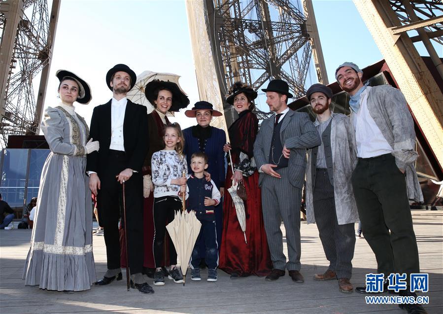 3月30日,在法國巴黎,音樂劇《300米高塔》的演員身著19世紀(jì)服裝在埃菲爾鐵塔一層平臺合影。于1889年3月31日正式落成的法國巴黎埃菲爾鐵塔迎來130歲生日。從30日起,包括演出、冒險游戲、圖片展在內(nèi)的多項活動在埃菲爾鐵塔舉行,為這座宏偉建筑慶生。新華社記者 高靜 攝