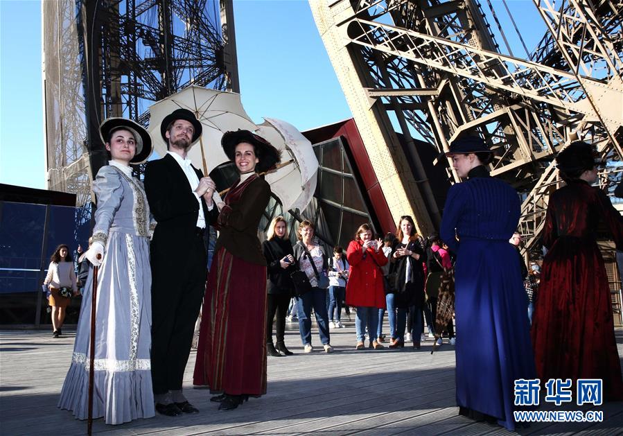 3月30日,在法國巴黎,音樂劇《300米高塔》的演員身著19世紀(jì)服裝在埃菲爾鐵塔一層平臺與游客合影。于1889年3月31日正式落成的法國巴黎埃菲爾鐵塔迎來130歲生日。從30日起,包括演出、冒險游戲、圖片展在內(nèi)的多項活動在埃菲爾鐵塔舉行,為這座宏偉建筑慶生。新華社記者 高靜 攝