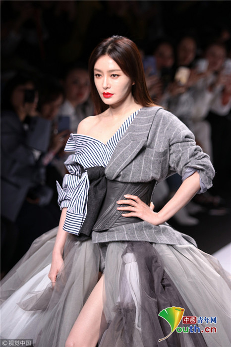 2019年3月31日,上海,2019上海秋冬時裝周,秦嵐助陣古巨基自創(chuàng)品牌大秀。她穿西裝紗紗裙笑容滿面可鹽可甜,斜肩小西裝正好能露出天鵝頸的線條,性感又不失知性。“五阿哥”古巨基則穿著隨性,與“知畫”牽手走秀,引起滿滿“回憶殺”。