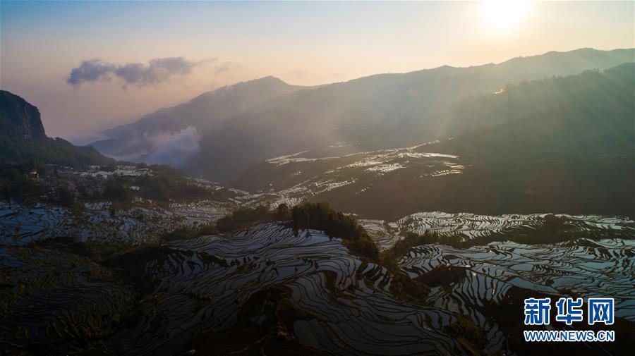 這是在云南省元陽縣拍攝的晨曦中的哈尼梯田美景(4月4日無人機(jī)拍攝)。哈尼梯田位于云南省哀牢山南部,以哈尼族為主的當(dāng)?shù)厝罕娗О倌陙砩幌⒃诖蟮厣稀暗窨獭背鲞@一農(nóng)耕文明奇觀。春日里,漫山的水稻梯田與云海、森林、村莊形成一幅美麗的畫卷,吸引眾多海內(nèi)外游客前來觀賞。新華社記者 胡超 攝