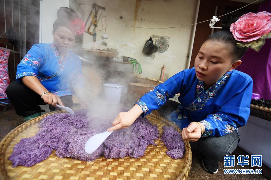 4月17日,在貴州省臺江縣姊妹街哆蝶五彩姊妹飯體驗店,苗家婦女將蒸熟的五彩“姊妹飯”進(jìn)行攤晾。 新華社記者 楊文斌 攝