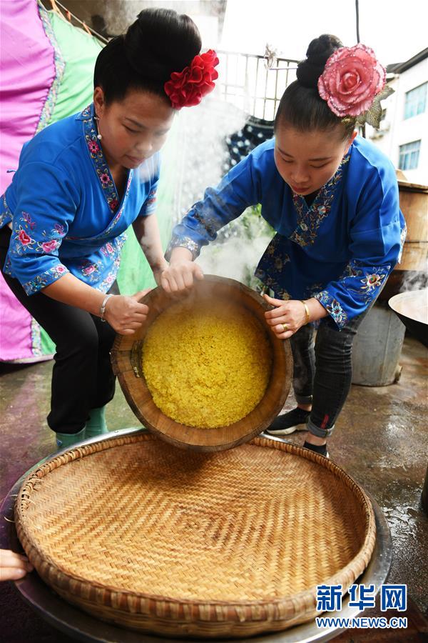 4月17日,在貴州省臺江縣姊妹街哆蝶五彩姊妹飯體驗店,苗家婦女在蒸煮五彩“姊妹飯”。新華社記者 楊文斌 攝