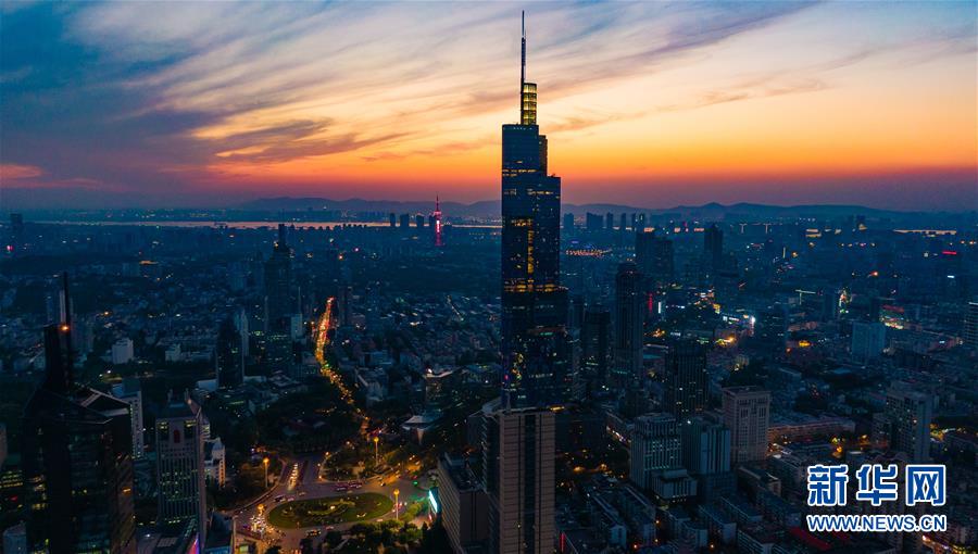 這是4月17日無人機(jī)拍攝的南京紫峰大廈和城市夜景。 新華社記者 李博 攝