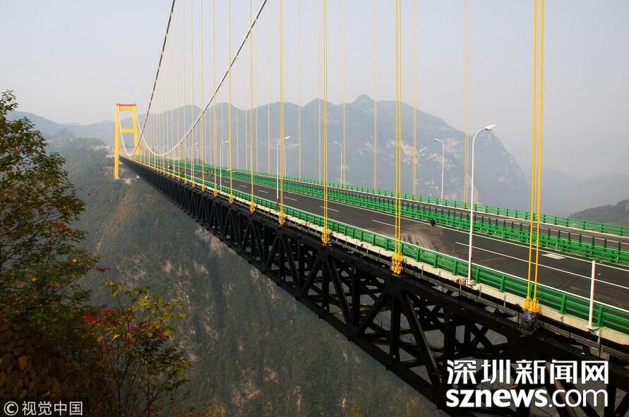 【世界第一高懸索橋——四渡河大橋】四渡河特大橋位于巴東縣野三關(guān)鎮(zhèn)四渡河,大橋主跨900米,橋面與峽谷谷底高差達560米,相當(dāng)于200層樓高,是目前國內(nèi)在深山峽谷里修建的最大跨度懸索橋,比目前世界最高橋法國米約大橋還要高290米,被譽為世界第一高懸索橋。