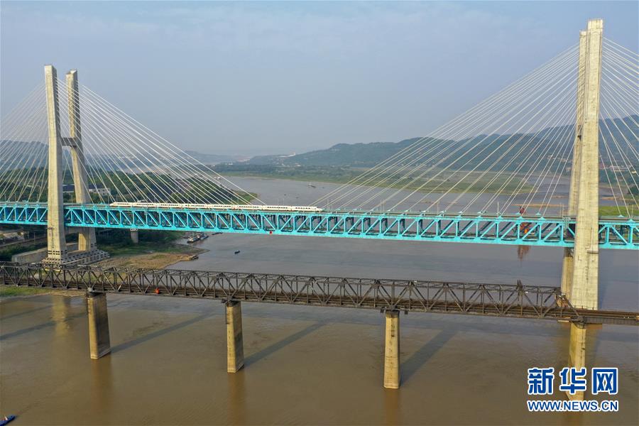 一列高鐵列車從新白沙沱長江特大橋上駛過(4月23日無人機拍攝)。 4月23日下午5點40分,隨著重慶白沙沱長江大橋通行的最后一列客運列車順利通過,這座“服役”了59年的重慶首座長江大橋進入“退役”倒計時。4月24日后,所有列車將改線經(jīng)距白沙沱長江大橋約100米的新白沙沱長江特大橋通行,新橋“接力”老橋,運輸能力將得到大幅提升。 白沙沱長江大橋于1958年開工,1960年通過首趟列車,是繼武漢長江大橋之后的第二座長江大橋。 新華社記者 劉潺 攝