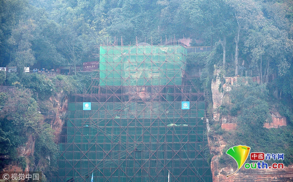 12月10日前后已逐步遮蔽大佛頭部,對(duì)頭面部進(jìn)行勘測(cè);12月底將開始拆除頭部腳手架,保證2019年元旦節(jié)之前,先露出佛頭,供游客觀賞。