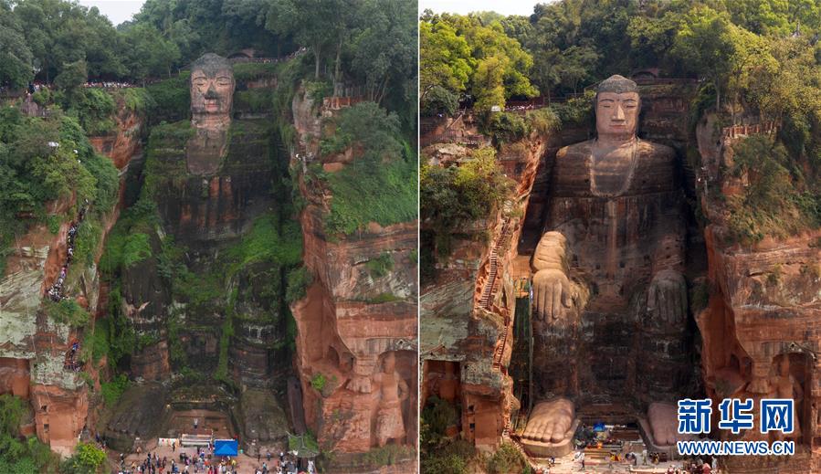 這是一張拼版照片:左圖為體檢與搶救性修復(fù)工作前的樂山大佛(2018年10月4日無(wú)人機(jī)拍攝);右圖為體檢與搶救性修復(fù)工作后的樂山大佛(3月29日無(wú)人機(jī)拍攝)。新華社記者 江宏景 攝