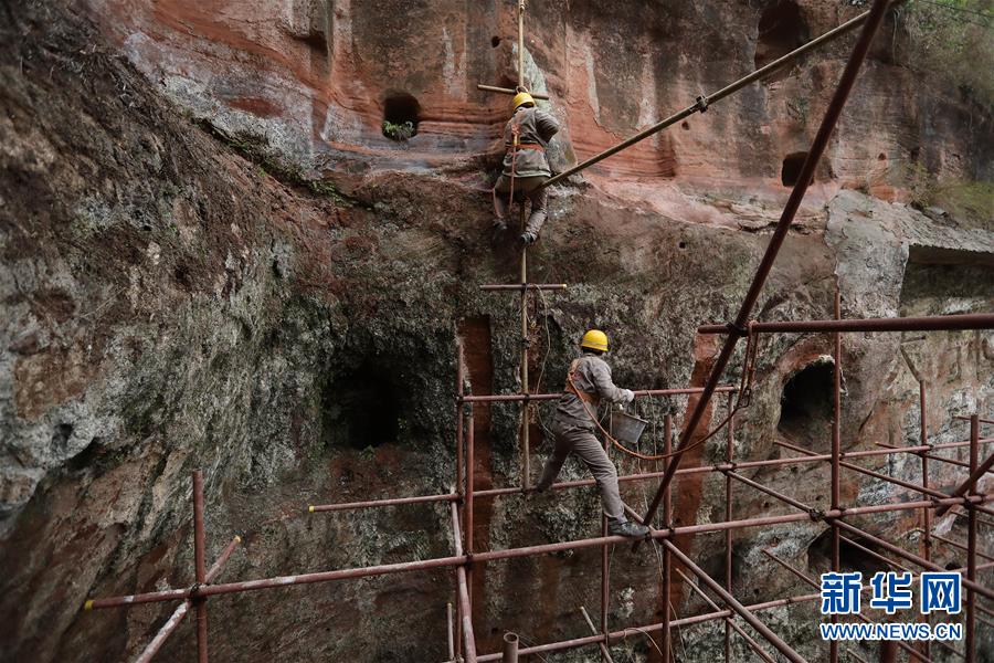 中鐵西北科學(xué)研究院有限公司文保中心的工作人員對(duì)大佛巖體進(jìn)行保護(hù)性清理(3月17日攝)。新華社記者 江宏景 攝