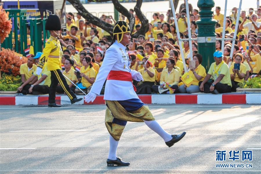 5月5日,儀仗隊(duì)在曼谷大王宮附近舉行的泰國國王加冕典禮巡游上列隊(duì)前進(jìn)。 新華社發(fā)(拉亨攝)