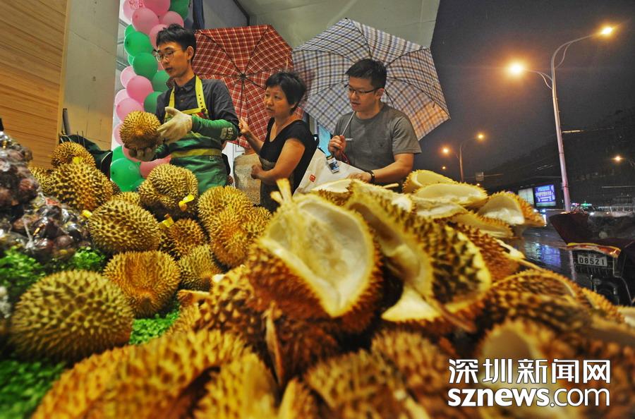 2017年6月5日夜里,武漢一家水果店正進(jìn)行金枕榴蓮打折促銷,門前堆積如山的榴蓮殼頗為壯觀,不少市民聞著榴蓮散發(fā)的濃郁味道前來排隊(duì)選購,雨夜里食客們依舊絡(luò)繹不絕。