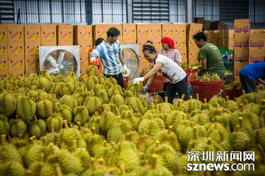 2018年4月20日晚上11點(diǎn),泰國尖竹汶府的金枕頭榴蓮分裝廠區(qū)內(nèi)燈火通明,工人們正在對(duì)剛摘下來的20多噸榴蓮打包、稱重。