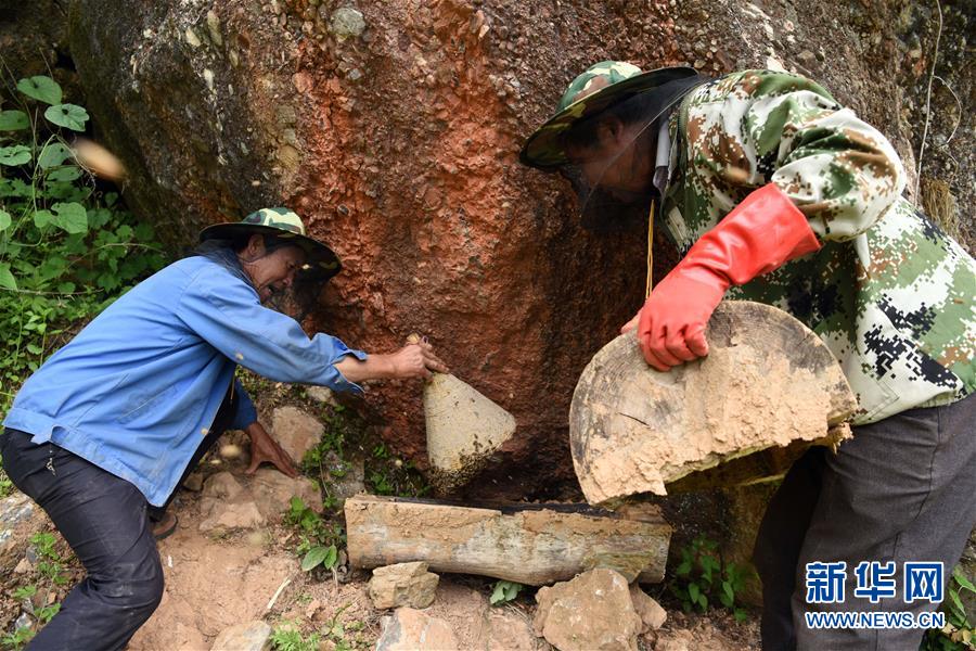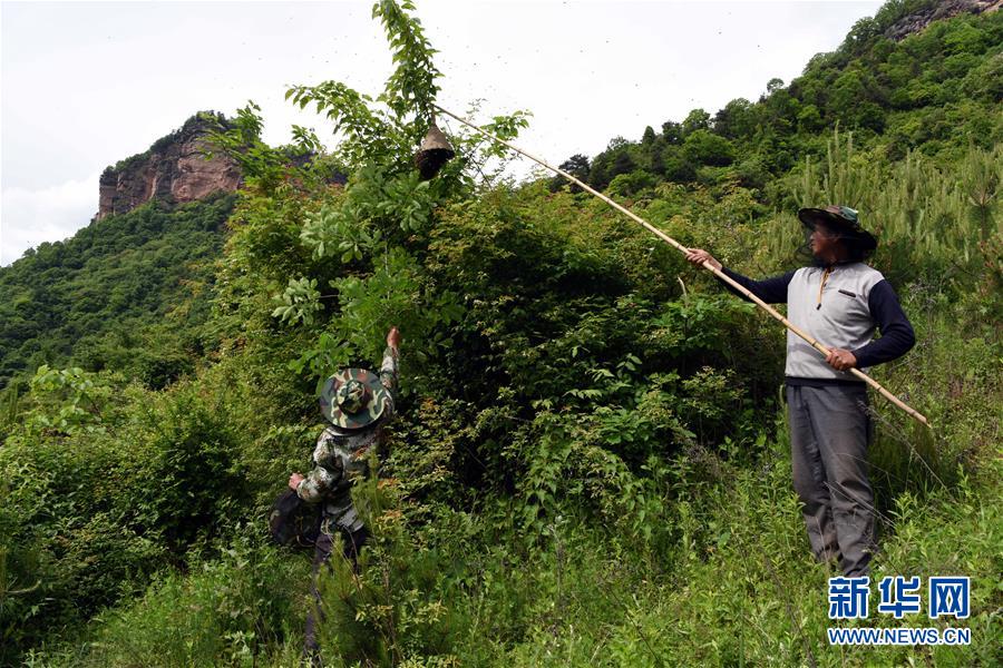 5月10日,在甘肅省隴南市徽縣大河店鎮(zhèn)硬灣村,蜂農(nóng)周仲頤(右)在收蜂。 甘肅省隴南市徽縣大河店鎮(zhèn)硬灣村位于秦巴山區(qū)深處,2017年,在當(dāng)?shù)卣姆龀窒?,龍崖老巢蜜養(yǎng)殖農(nóng)民專業(yè)合作社成立,蜂農(nóng)們將傳統(tǒng)養(yǎng)蜂技藝和現(xiàn)代加工方式相結(jié)合,并通過電商等渠道打開銷路,有效帶動(dòng)了當(dāng)?shù)刎毨Т迕衩撠氈赂?。目前整個(gè)合作社共有蜂箱2000余個(gè),每箱每年可帶來三四千元的收入。 新華社記者 馬寧 攝