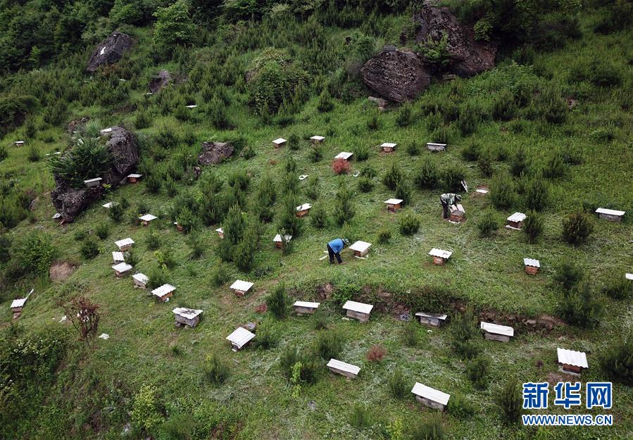 5月10日,在甘肅省隴南市徽縣大河店鎮(zhèn)硬灣村,蜂農(nóng)查看蜂箱情況(無人機(jī)拍攝)。 甘肅省隴南市徽縣大河店鎮(zhèn)硬灣村位于秦巴山區(qū)深處,2017年,在當(dāng)?shù)卣姆龀窒?,龍崖老巢蜜養(yǎng)殖農(nóng)民專業(yè)合作社成立,蜂農(nóng)們將傳統(tǒng)養(yǎng)蜂技藝和現(xiàn)代加工方式相結(jié)合,并通過電商等渠道打開銷路,有效帶動(dòng)了當(dāng)?shù)刎毨Т迕衩撠氈赂弧D壳罢麄€(gè)合作社共有蜂箱2000余個(gè),每箱每年可帶來三四千元的收入。 新華社記者 馬寧 攝