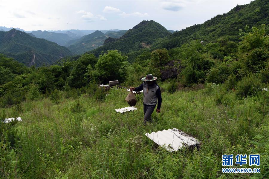 5月10日,在甘肅省隴南市徽縣大河店鎮(zhèn)硬灣村,蜂農(nóng)周仲頤在收蜂。 甘肅省隴南市徽縣大河店鎮(zhèn)硬灣村位于秦巴山區(qū)深處,2017年,在當(dāng)?shù)卣姆龀窒?,龍崖老巢蜜養(yǎng)殖農(nóng)民專業(yè)合作社成立,蜂農(nóng)們將傳統(tǒng)養(yǎng)蜂技藝和現(xiàn)代加工方式相結(jié)合,并通過電商等渠道打開銷路,有效帶動(dòng)了當(dāng)?shù)刎毨Т迕衩撠氈赂弧D壳罢麄€(gè)合作社共有蜂箱2000余個(gè),每箱每年可帶來三四千元的收入。 新華社記者 馬寧 攝