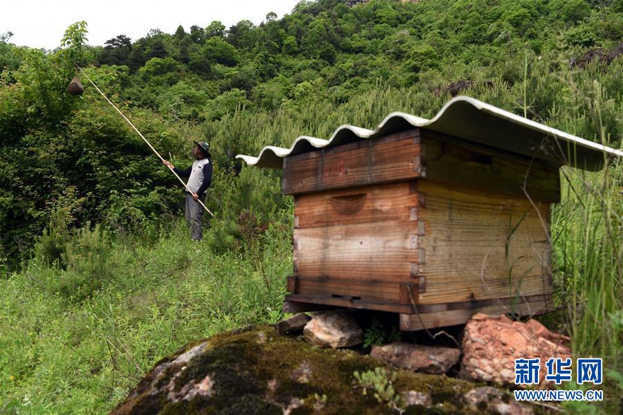 5月10日,在甘肅省隴南市徽縣大河店鎮(zhèn)硬灣村,蜂農(nóng)周仲頤在收蜂。 甘肅省隴南市徽縣大河店鎮(zhèn)硬灣村位于秦巴山區(qū)深處,2017年,在當(dāng)?shù)卣姆龀窒?,龍崖老巢蜜養(yǎng)殖農(nóng)民專業(yè)合作社成立,蜂農(nóng)們將傳統(tǒng)養(yǎng)蜂技藝和現(xiàn)代加工方式相結(jié)合,并通過電商等渠道打開銷路,有效帶動(dòng)了當(dāng)?shù)刎毨Т迕衩撠氈赂?。目前整個(gè)合作社共有蜂箱2000余個(gè),每箱每年可帶來三四千元的收入。 新華社記者 馬寧 攝