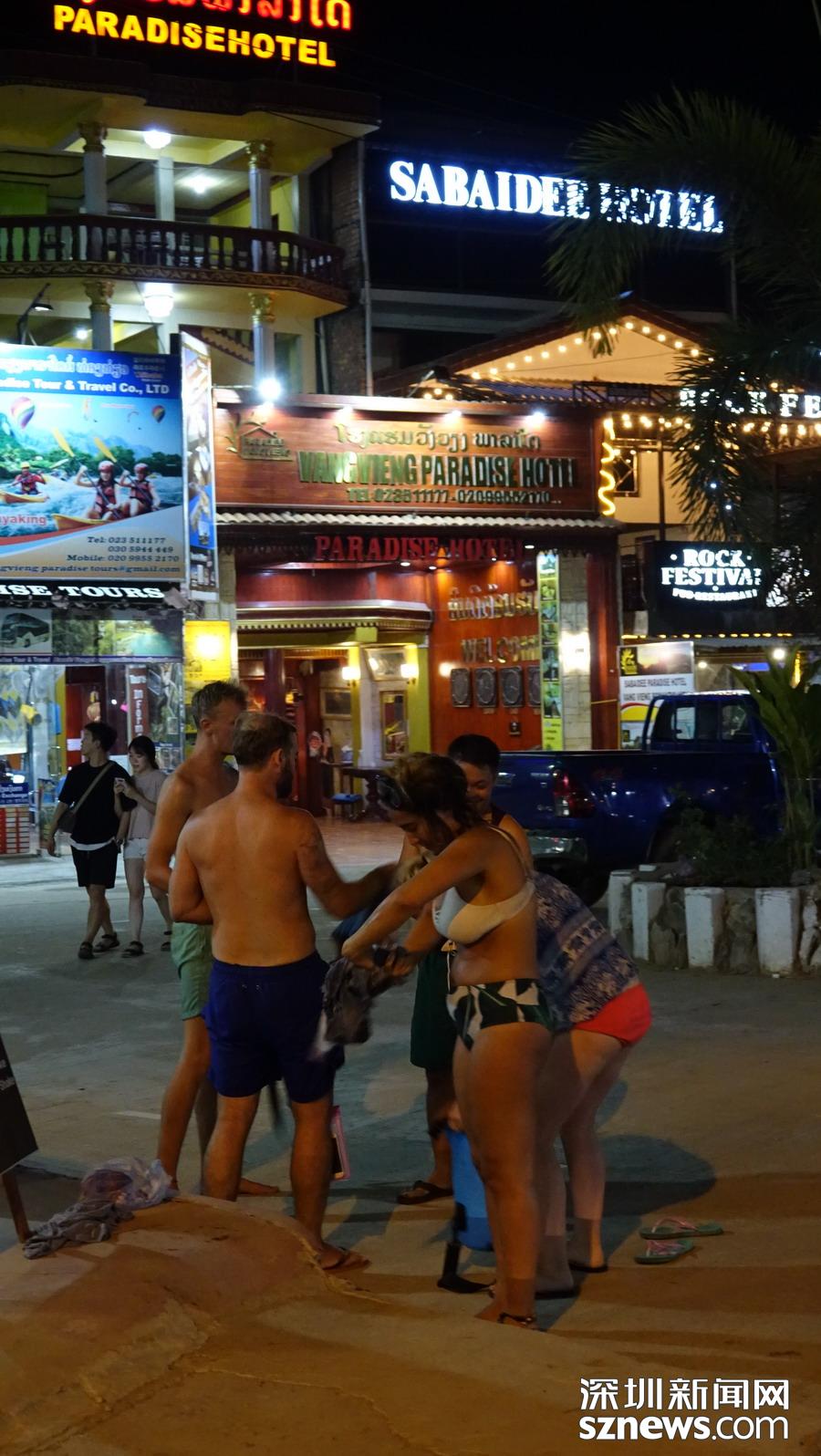 萬榮的開放程度很高。夜晚,南松河畔、街道兩旁都是酒吧,常常可以看到漂流回來身著泳裝的“老外”當(dāng)街站立。李仁奇   攝