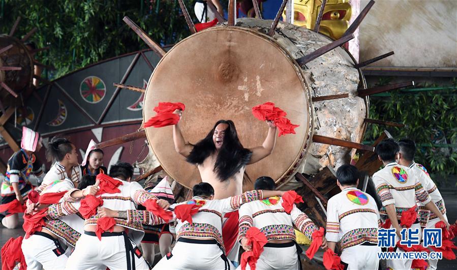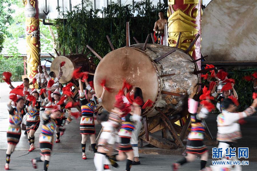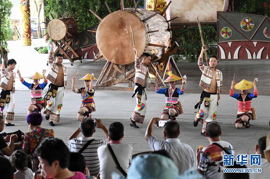 基諾族演員在表演大鼓舞(6月1日攝)。 在云南省西雙版納傣族自治州景洪市基諾山基諾族鄉(xiāng)的基諾族村寨,每天的基諾大鼓舞表演吸引了眾多游客前來(lái)觀賞體驗(yàn),帶動(dòng)了基諾族群眾就業(yè)和增收?;Z族大鼓舞蘊(yùn)涵豐富的歷史文化內(nèi)涵,已被列入國(guó)家級(jí)非物質(zhì)文化遺產(chǎn)保護(hù)名錄。 新華社記者 楊宗友 攝
