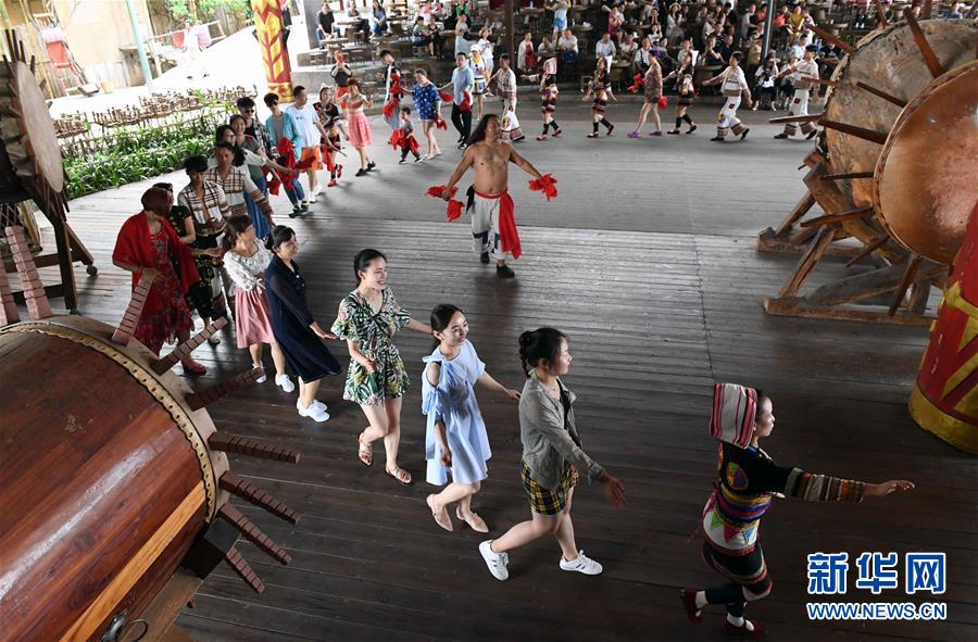 游客與基諾族大鼓舞演員一起跳舞(6月1日攝)。 在云南省西雙版納傣族自治州景洪市基諾山基諾族鄉(xiāng)的基諾族村寨,每天的基諾大鼓舞表演吸引了眾多游客前來(lái)觀賞體驗(yàn),帶動(dòng)了基諾族群眾就業(yè)和增收?;Z族大鼓舞蘊(yùn)涵豐富的歷史文化內(nèi)涵,已被列入國(guó)家級(jí)非物質(zhì)文化遺產(chǎn)保護(hù)名錄。 新華社記者 楊宗友 攝