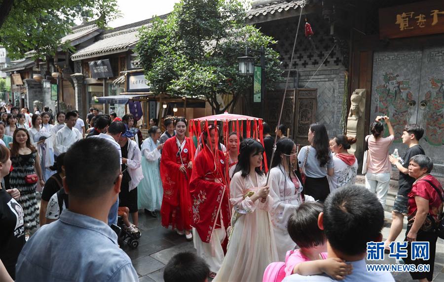 6月9日,漢服愛(ài)好者在成都寬窄巷子巡游,宣傳“聞香識(shí)寬窄”主題活動(dòng)。新華社記者 江宏景 攝