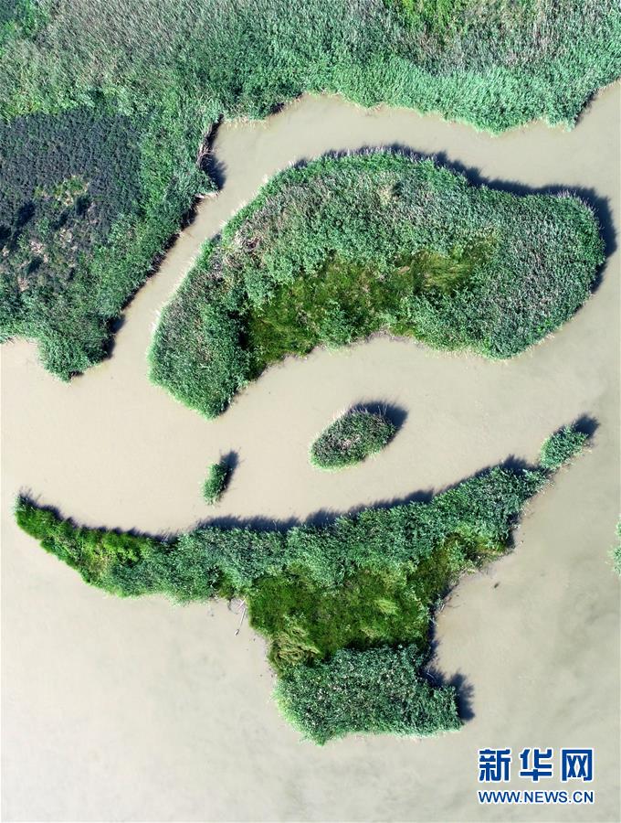這是天津市寧河區(qū)七里海濕地內(nèi)蘆葦和水面形成的圖案(6月22日無人機(jī)拍攝)。