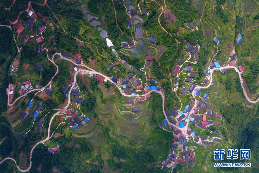 在融水苗族自治縣桿洞鄉(xiāng)黨鳩村下黨鳩屯,道路已經(jīng)修到家家戶戶門前(6月21日無(wú)人機(jī)拍攝)。新華社記者 黃孝邦 攝