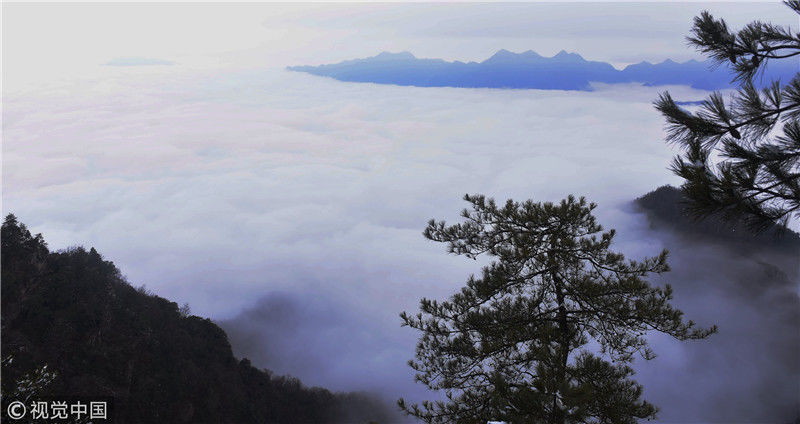2019年3月3日,陜西商洛,位于鎮(zhèn)安縣的塔云山景區(qū)云海翻騰,宛如仙境。