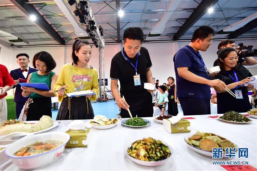 8月3日,在鄉(xiāng)村美食文化大賽現(xiàn)場,評委在對菜品進行評定。新華社記者馮大鵬攝