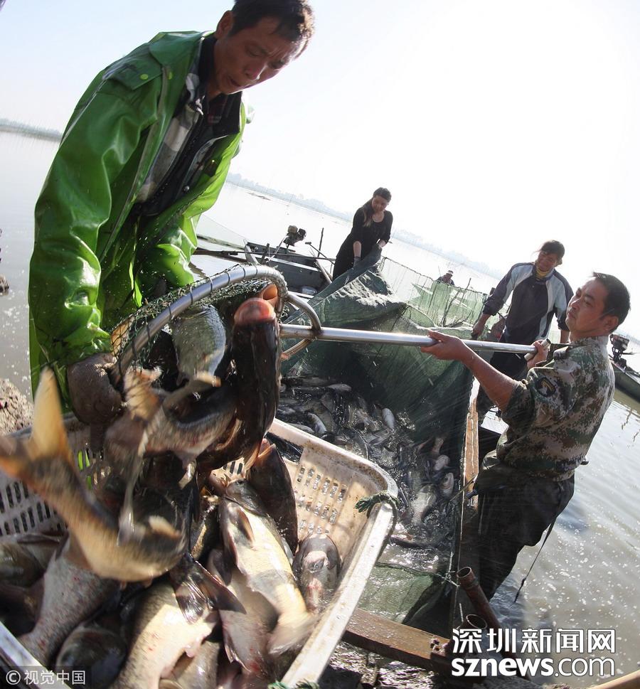 江蘇揚(yáng)州,漁夫?qū)Ⅳ~撈出過秤。
