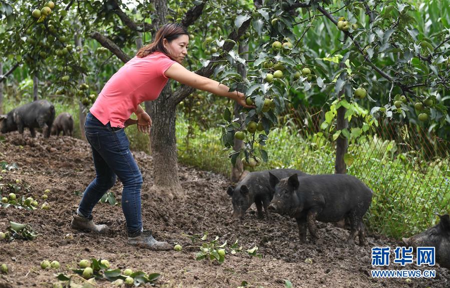 8月20日,康丹丹在果園內(nèi)喂豬吃蘋果梨。新華社記者 王昊飛 攝