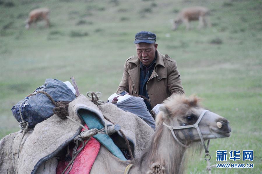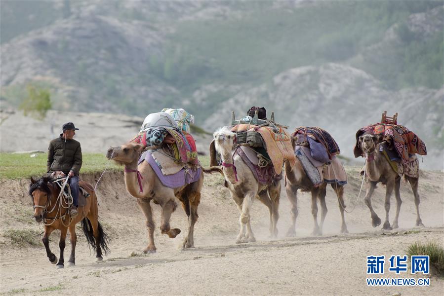 新疆阿勒泰地區(qū)福海縣牧民帶著駝隊行進在轉(zhuǎn)場途中(6月6日攝)。新華社記者丁磊攝