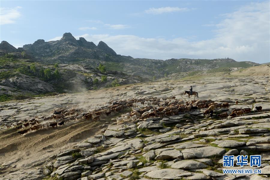 6月6日,新疆阿勒泰地區(qū)福??h牧民趕著轉(zhuǎn)場牲畜翻越山頭。 新華社記者 丁磊 攝