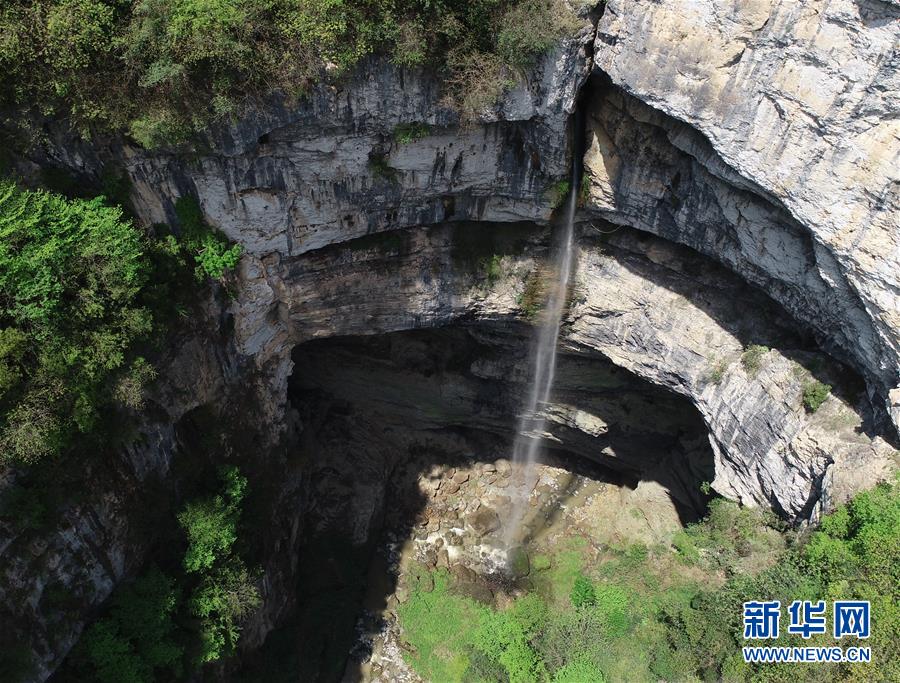 4月22日無人機(jī)拍攝的地洞河天坑。 新華社記者 張博文 攝