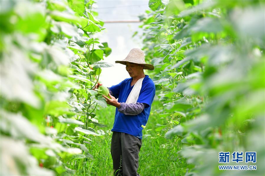 在廣西融安縣大良鎮(zhèn)古蘭村古蘭屯大棚基地,62歲的黃顯亮查看甜瓜生長情況(8月18日攝)。黃顯亮是大棚基地的技術(shù)員,每個月有3000多元的工資,已于2018年實(shí)現(xiàn)脫貧。 新華社記者 黃孝邦 攝