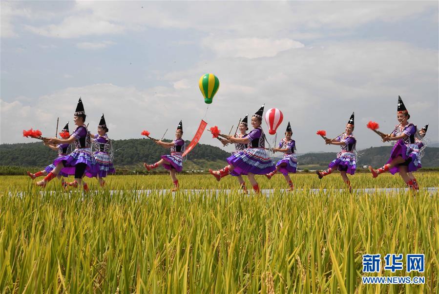 9月15日,人們在田野里表演舞蹈《吹響蘆笙慶豐收》。新華社記者 楊宗友 攝