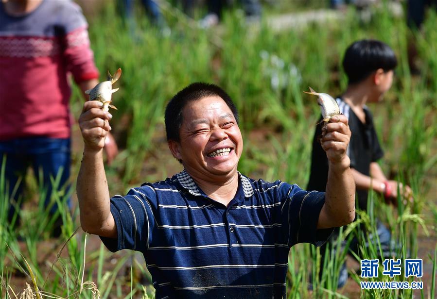 9月15日,人們在稻田里參加摸魚比賽。 新華社記者 楊宗友 攝
