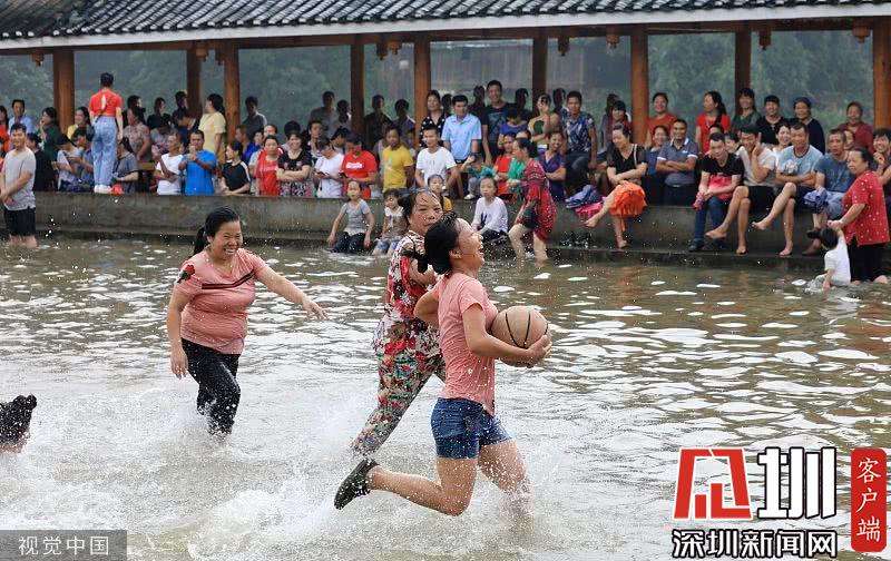 在廣西柳州市融安縣長安鎮(zhèn)安寧村大袍屯,人們在水上籃球比賽中拼搶。
