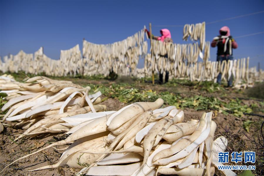 9月30日,寧夏吳忠市紅寺堡區(qū)馬渠生態(tài)移民安置區(qū)的農(nóng)民在晾曬蘿卜。新華社記者 馮開華 攝