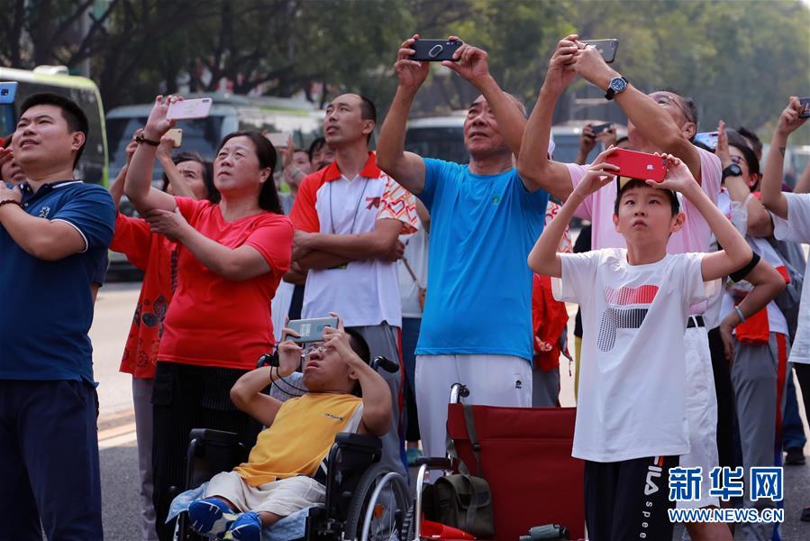 10月1日,市民在北京南新華街拍攝飛過北京上空的受閱飛機(jī)。當(dāng)日是國慶節(jié),全國各地的人們用各種方式歡度節(jié)日。新華社記者 薛東梅 攝
