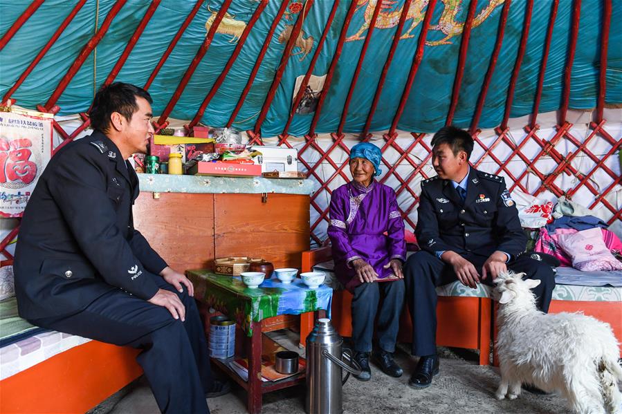 9月27日,內(nèi)蒙古自治區(qū)額濟(jì)納旗算井子邊境派出所民警走訪看望牧民蘇伊勒?qǐng)D雅(中)。新華社記者劉磊攝