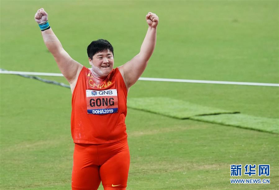 當日,在卡塔爾多哈舉行的2019國際田聯(lián)世界田徑錦標賽女子鉛球決賽中,衛(wèi)冕冠軍、中國選手鞏立姣以19米55的成績奪得冠軍。 新華社記者李鋼攝
