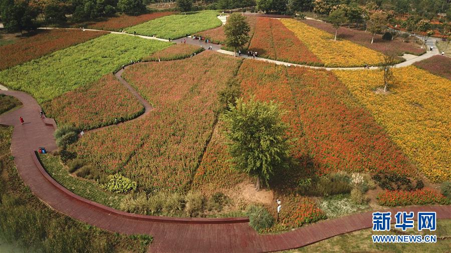 10月9日,游人在四季花海城市公園游覽(無(wú)人機(jī)拍攝)。 秋日時(shí)節(jié),位于安徽省合肥市的四季花海城市公園花香四溢,色彩繽紛,成為游客和市民休閑游玩的好去處。 新華社記者 張端 攝