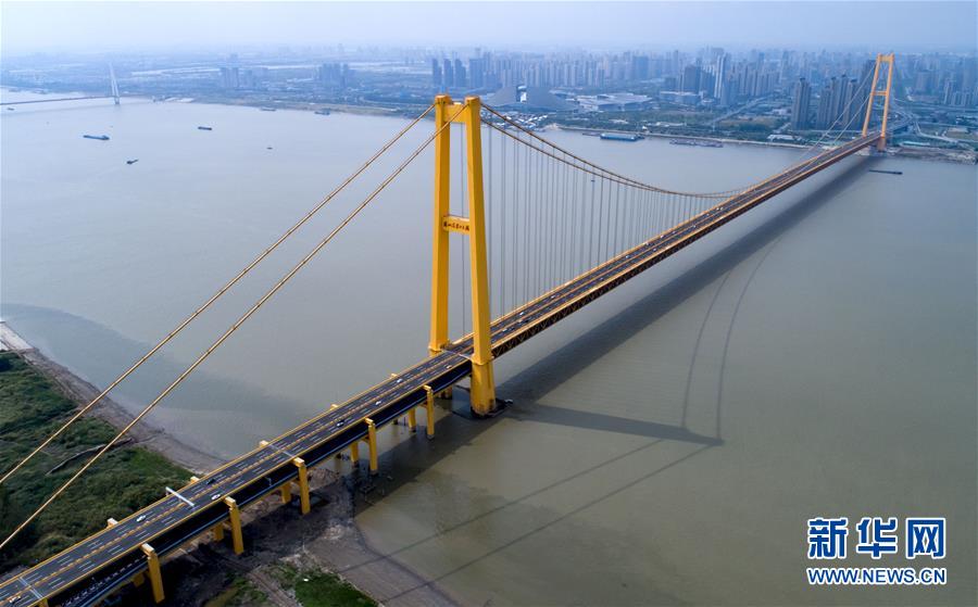 楊泗港大橋建設(shè)創(chuàng)造了多項(xiàng)世界之最:一是主橋跨度達(dá)1700米,為世界上跨度最大的雙層懸索橋;二是主橋設(shè)置雙層雙向12車道,是世界上通行能力最大的公路橋梁;三是大橋主纜設(shè)計(jì)張力6.5萬噸,采用了世界上強(qiáng)度等級最高的主纜鋼絲;四是大橋設(shè)置機(jī)動(dòng)車道、非機(jī)動(dòng)車道、人行觀光道,集過江交通與觀光于一體,是長江上功能最完備的橋梁。新華社記者熊琦攝